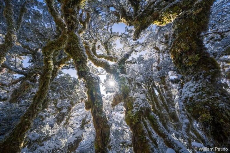 Буковая роща в лучах утреннего солнца: деревья причудливо изогнуты стихией и покрыты свежим снегом
