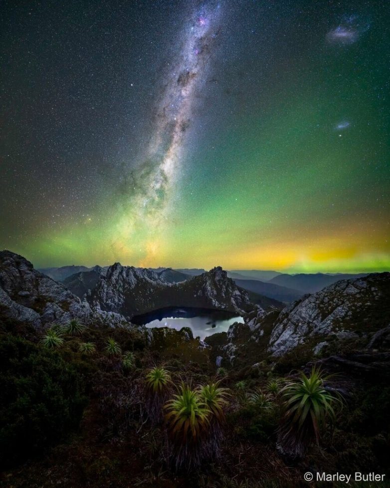 Полярное сияние над альпийским озером, которое запечатлел фотограф во время многодневных походов по Тасмании
