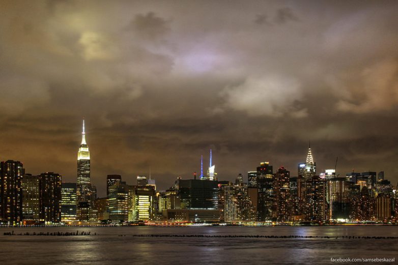 Свет отражается от низких облаков, висящих над мидтауном Манхэттена. Самое яркое пятно по центру — это Таймс-сквер. Снято из бруклинского Гринпоинта.