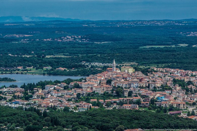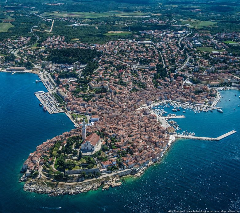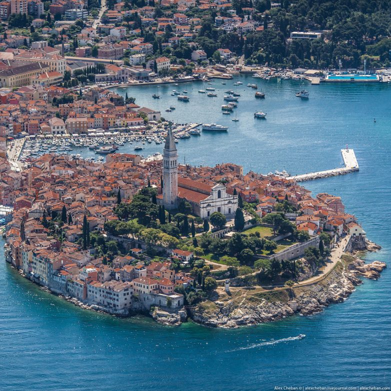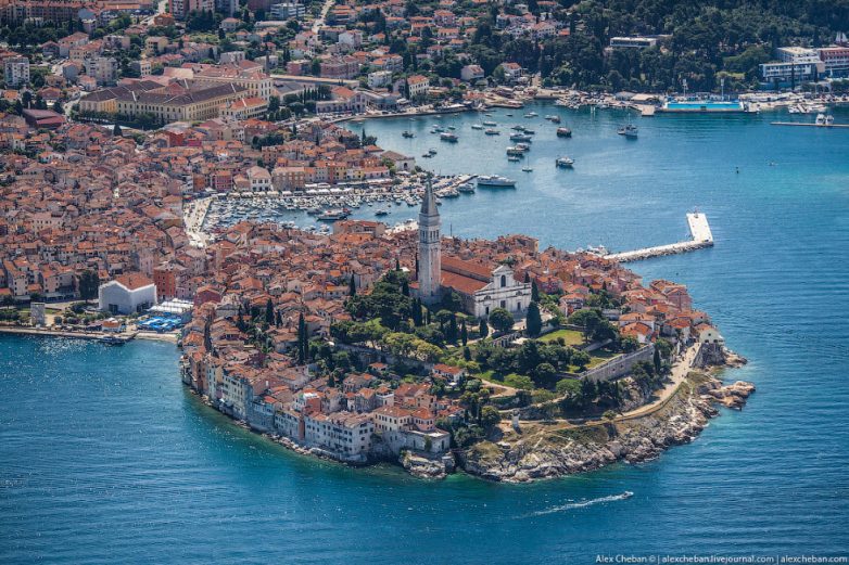 Ровинь. Самый красивый город Истрии… Впрочем, определение «самый красивый» тут применимо к каждому второму городку на побережье, но Ровинь какой-то особенный. Я поднялся на колокольню собора Св. Евфимии за день до полета, а сейчас увидел город с борта спортивного самолёта.