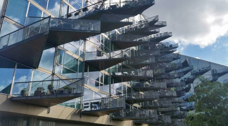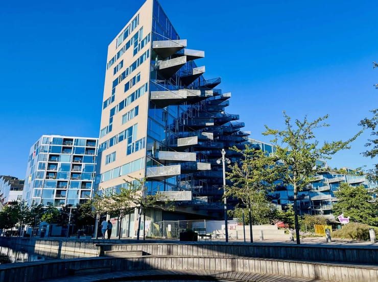 При этом за эффектной формой скрывается вполне прагматичное решение. Балконы спроектированы так, чтобы не перекрывать друг другу солнечный свет. Благодаря этому дневное освещение проникает глубоко внутрь квартир, что особенно важно в северных широтах. Архитектура здесь работает не только на визуальный эффект, но и на качество жизни жильцов.