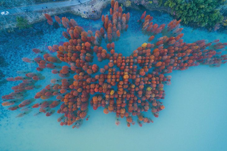 Осенние деревья в небольшом озере вблизи Нанкина, Китай. (Фото Yaorusheng):