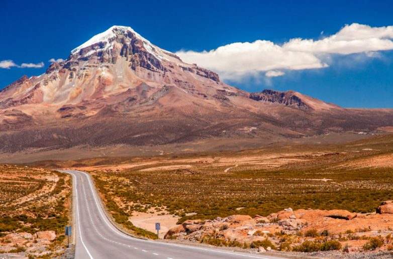 На фото: альпаки, пасущиеся у подножия заснеженного вулкана. Национальный парк Лаука, Чили,