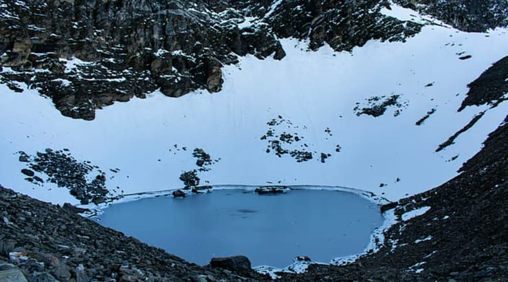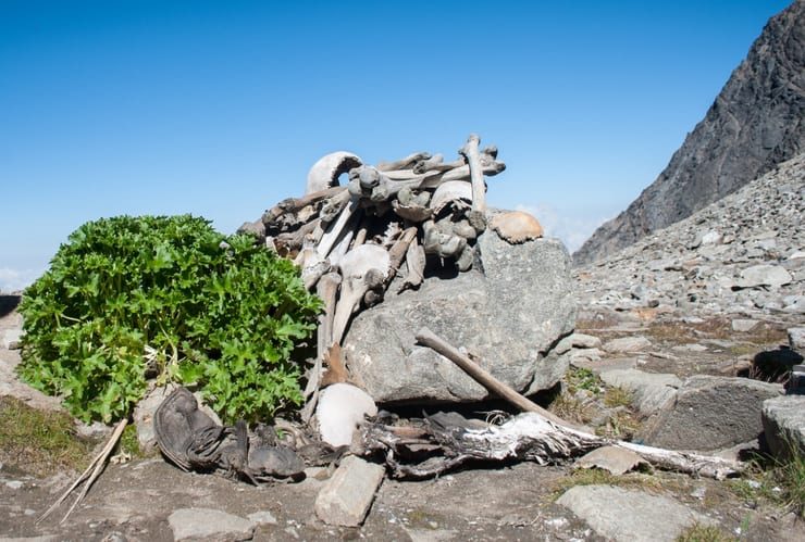 Большую часть года Роопкунд скован льдом. В ясные дни его вода удивительно прозрачна, и именно тогда становятся видны человеческие черепа, кости и фрагменты скелетов, лежащие на дне, словно застывшие во времени.