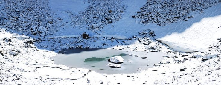 Озеро Роопкунд расположено на высоте около 5029 метров над уровнем моря в индийском штате Уттаракханд. Оно лежит у подножия гималайских вершин Трисул и Нандгхунти, в труднодоступной зоне, куда можно добраться лишь пешком в короткий летний сезон.
