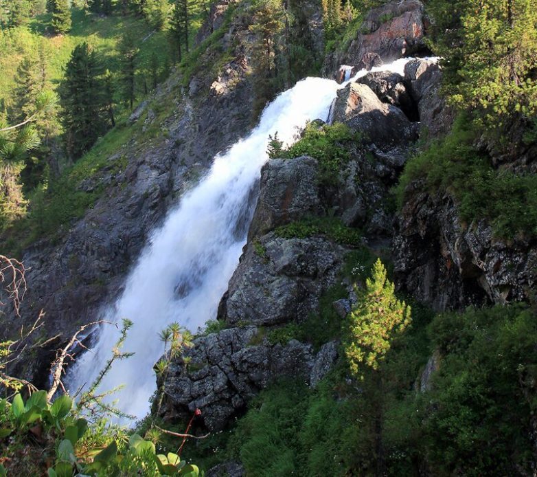 По гребню и скалам левого и правого бортов не падает вниз, а стекает узкими стремительными 'змейками'. При падении с большой высоты образуется мельчающая водяная пыль, ионизирующая воздух в долине. В солнечные дни, поднимаясь над водопадом, она раскрашивается всеми цветами радуги. Мощный водопад, живописное ущелье, поросшее прекрасным кедровым и еловым лесом, придают необычайную красоту и очарование этому уголку алтайской природы.
