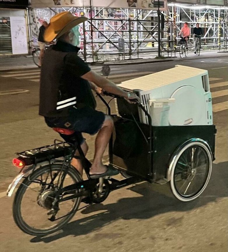 Фото, которое прекрасно характеризует Копенгаген: мужчина в ковбойской шляпе и вьетнамках перевозит сушилку на велике