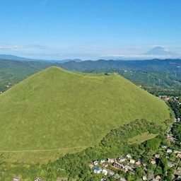На полуострове Идзу в префектуре Сидзуока находится один из самых необычных природных объектов Японии — гора Омуро. Потухший вулкан идеально круглой формы выглядит так, будто его выточили вручную: правильный конус, равномерные склоны и мягкая чашеобразная выемка наверху придают ему удивительно гармоничный силуэт.