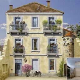 Французский уличный художник Патрик Коммеси (Patrick Commecy) превращает унылые и скучные фасады домов в яркие и привлекательные. Он создаёт на фасадах гиперреалистичные рисунки, изображая окна и балконы, на которых стоят известные местные жители прошлого и настоящего.